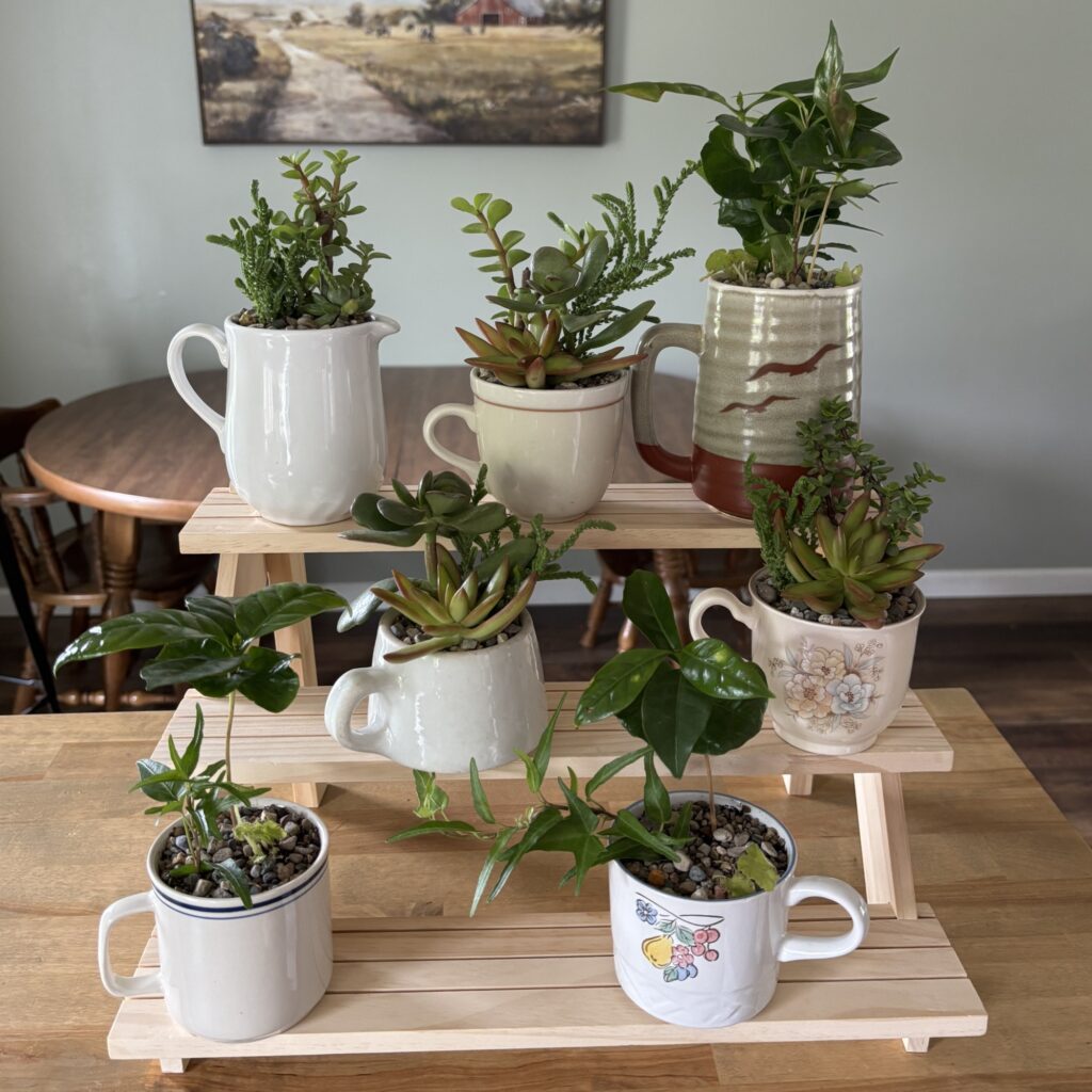 Our vintage mug planters are available at The Buechel Train Depot Farmer’s Market on select Sundays and the Shelby County Farmer’s Market on select Wednesdays.