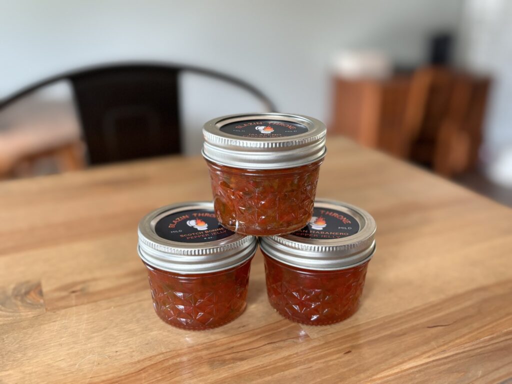 Welcome to Blazin’ Throne, your source for flavorful creations crafted from our homegrown hot peppers. Our jalapeƱo pepper jelly is now available for local pickup and at various upcoming farmer’s markets. Whether you’re looking to stock your pantry with new flavors or find a unique gift for someone else, you’ll find it here. We’re just getting started, so keep an eye out for our upcoming products!