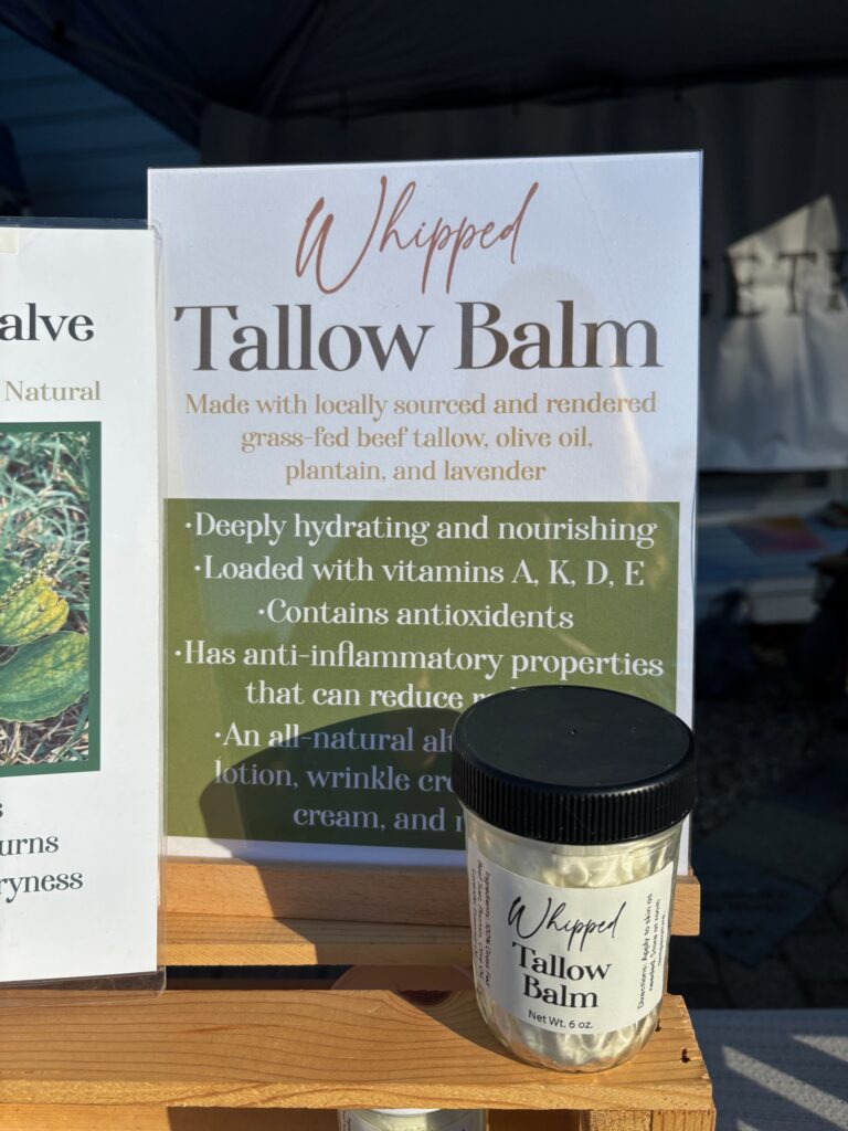 Her best sellers include the biggest sweet potatoes you’ve ever seen, mulberry jam, plantain salve, and whipped tallow balm. Message us to preorder salves and tallow items to ensure availability!