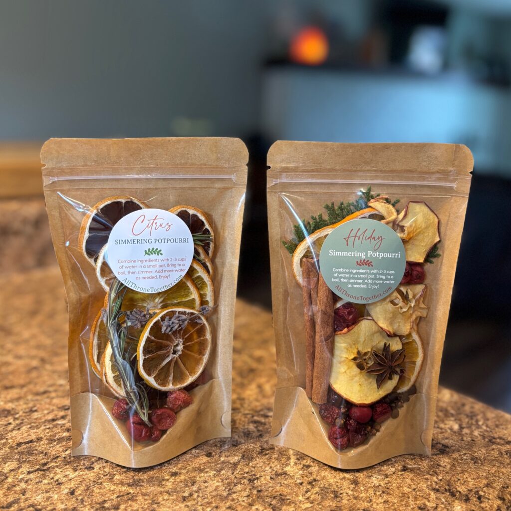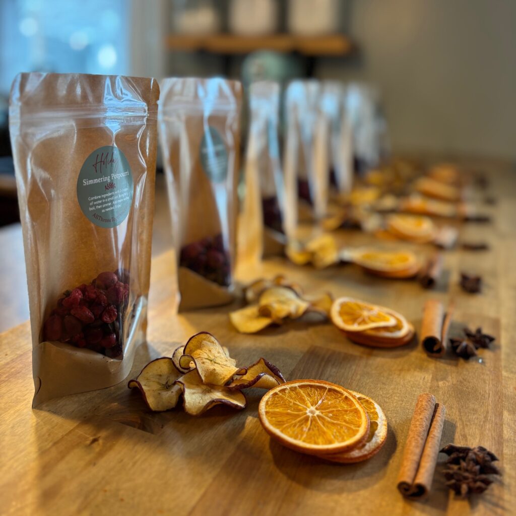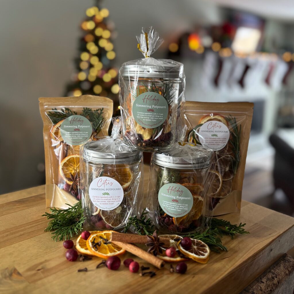 Our simmering potpourri blends are available year-round for porch pickup and at the farmer’s market. Specific scents available seasonally. Holiday preorders will open in the fall!